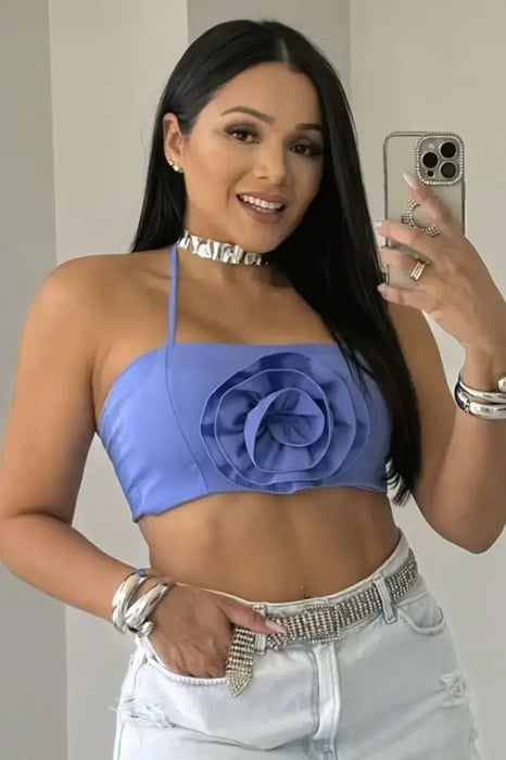 Cropped tomara que caia, com detalhe de rosa na frente e amarração atrás